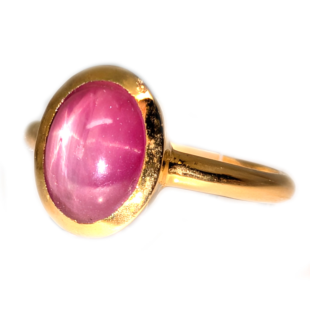 A star ruby ring featuring a stunning star ruby oval cabochon bezel-set in a simple gold vermeil band. The star effect is a special optical phenomenon called asterism, caused by tiny inclusions of rutile within the crystal that form a “star” of reflected light.
