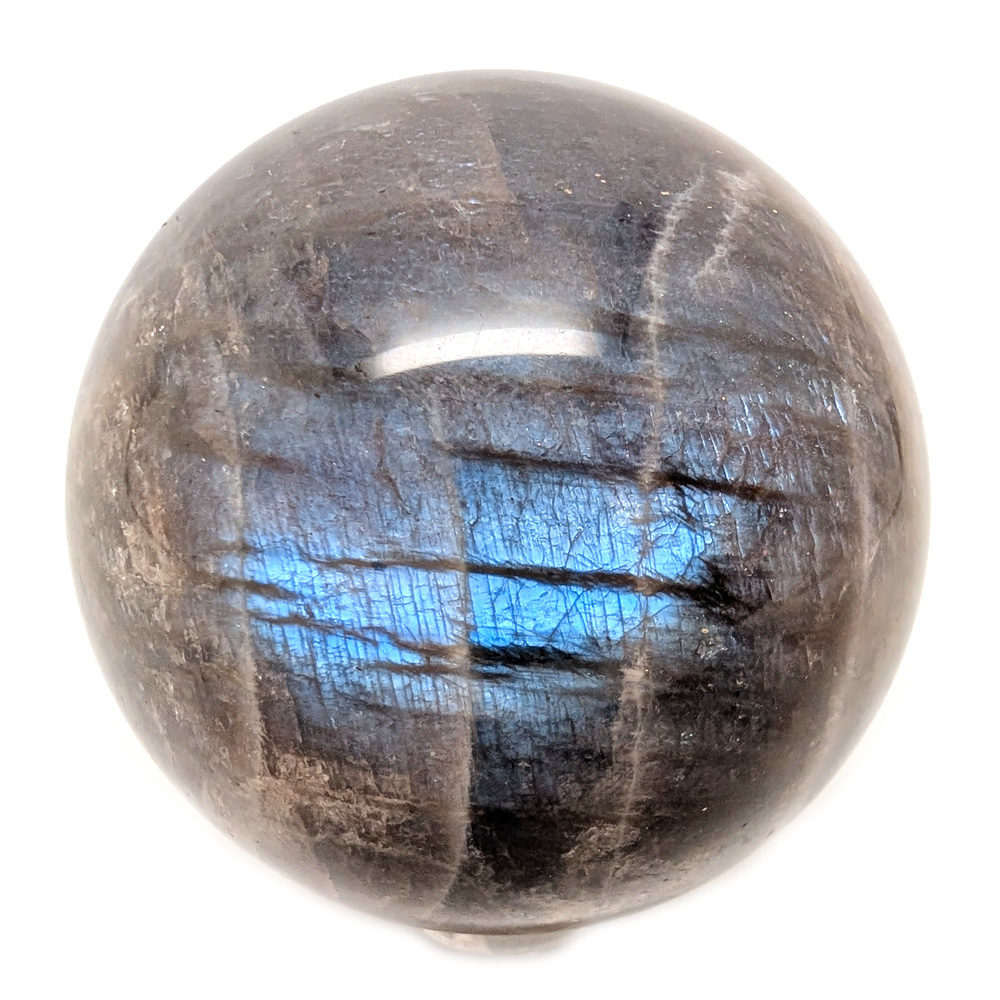 A sunstone moonstone sphere with blue flash from Tanzania. This new material is a rare blend of moonstone and sunstone that resembles peach moonstone but is more light orange-brown with flashes of blue and white.