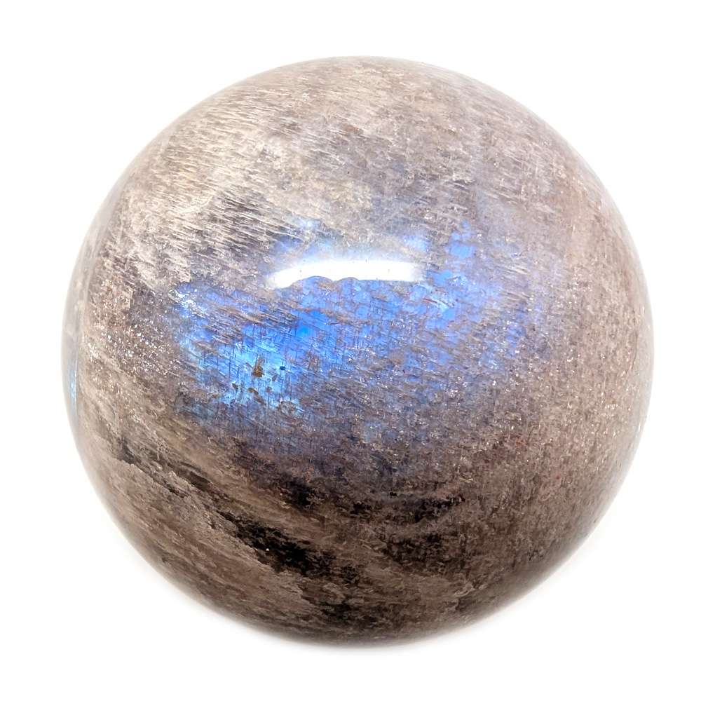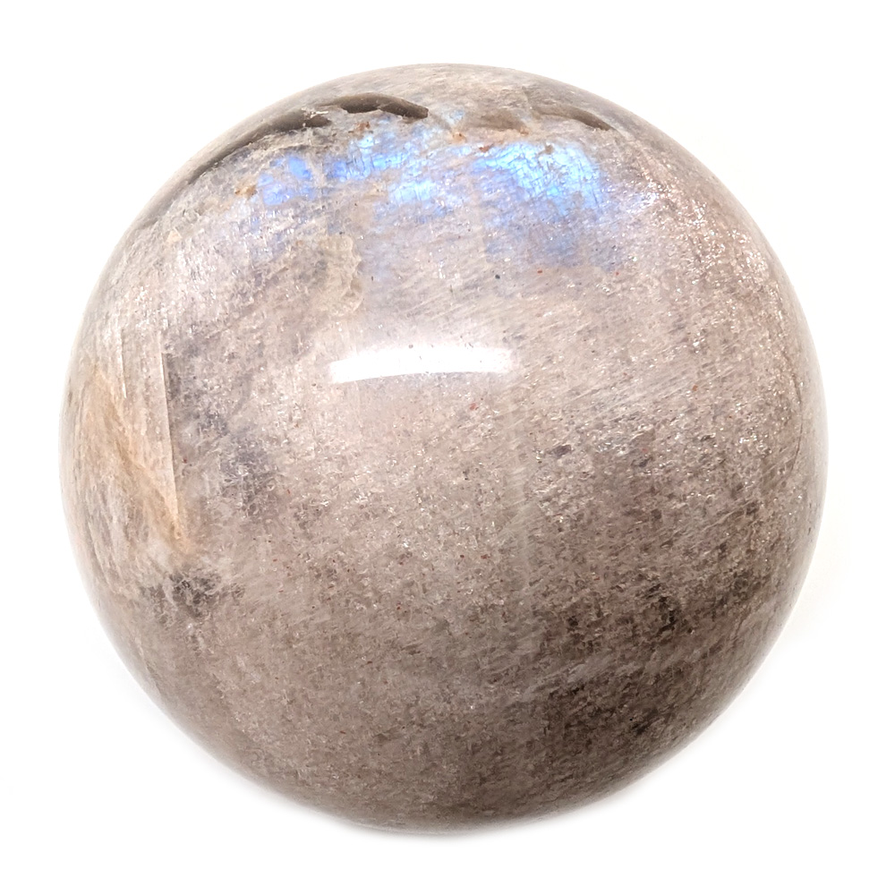 A sunstone moonstone sphere with blue flash from Tanzania. This new material is a rare blend of moonstone and sunstone that resembles peach moonstone but is more light orange-brown with flashes of blue and white.