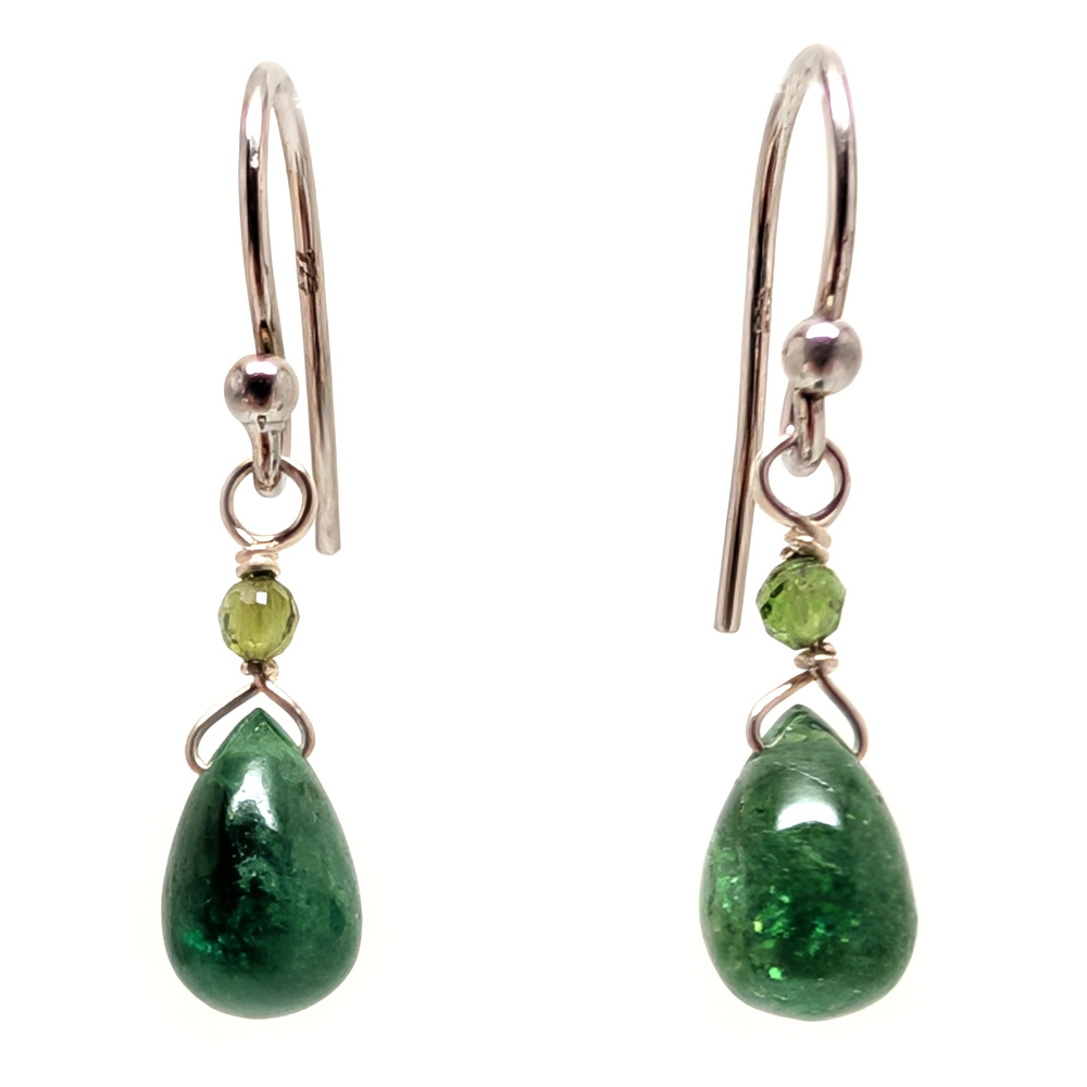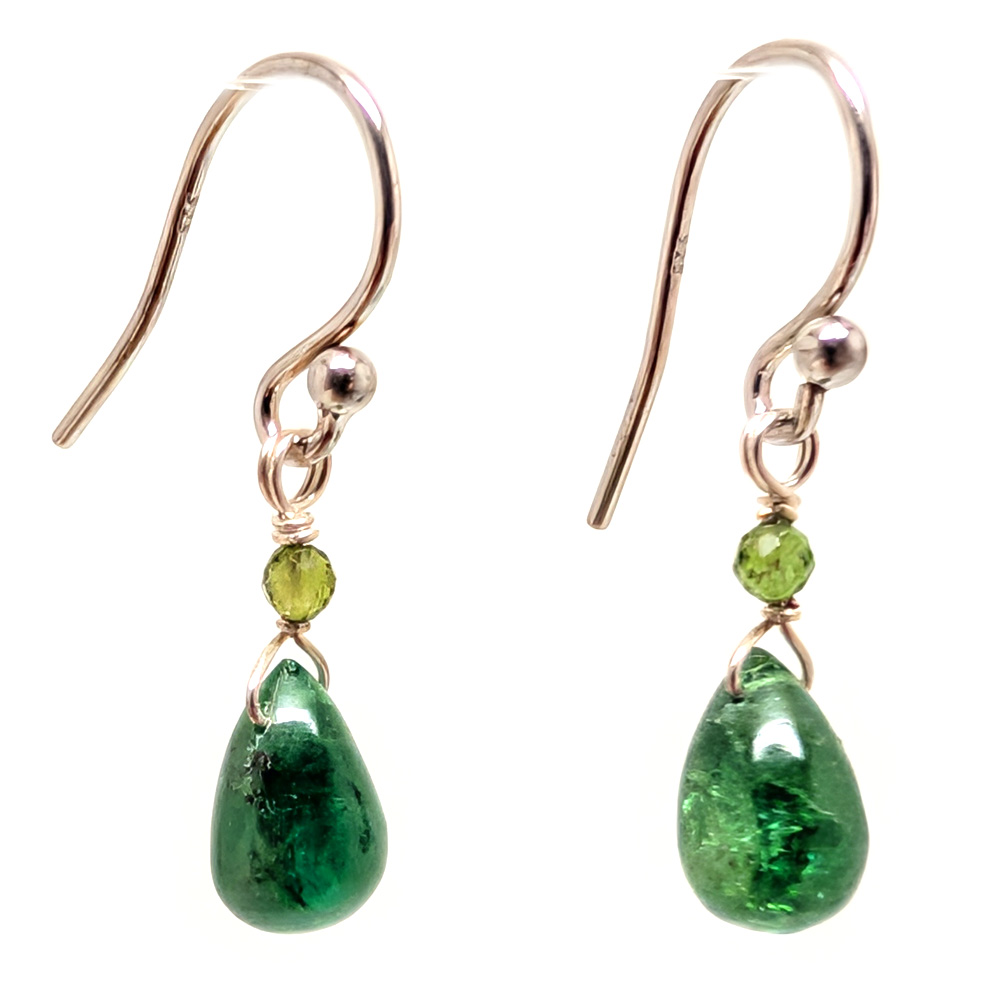 These tsavorite garnet earrings feature translucent a teardrop green garnet bead topped by a small round faceted peridot bead with sterling silver ear hooks. Tsavorite is a rare, highly sought after green version of garnet.