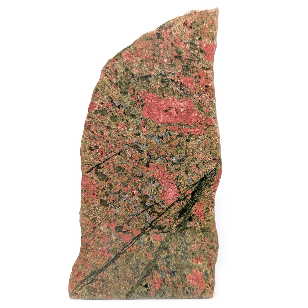A unakite slab polished on both sides and semi-polished on the edges, featuring deep pink-orange contrasting with forest green and one flat edge. This is the first time we’ve had larger pieces of polished unakite like this!